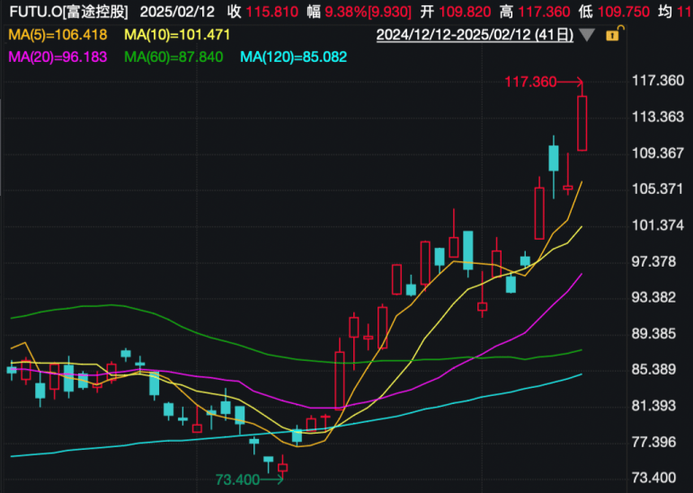 受近期中概股集体上扬影响,富途近期股价亦触底反弹。2月12日,富途美股股价上涨9.38%,收于117.36美元/股,相比于1月13日的区间低点73.4美元/股,累计上涨了57.78%。