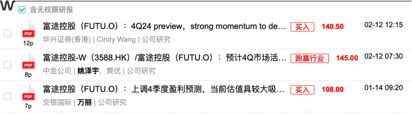 与之类似的还有华兴证券,在2月12日给出了140.5美元/股的目标价。瑞银也在2月11日发布的研究报告中,维持对富途控股的“买入”评级,并将目标价从114美元上调至130美元。